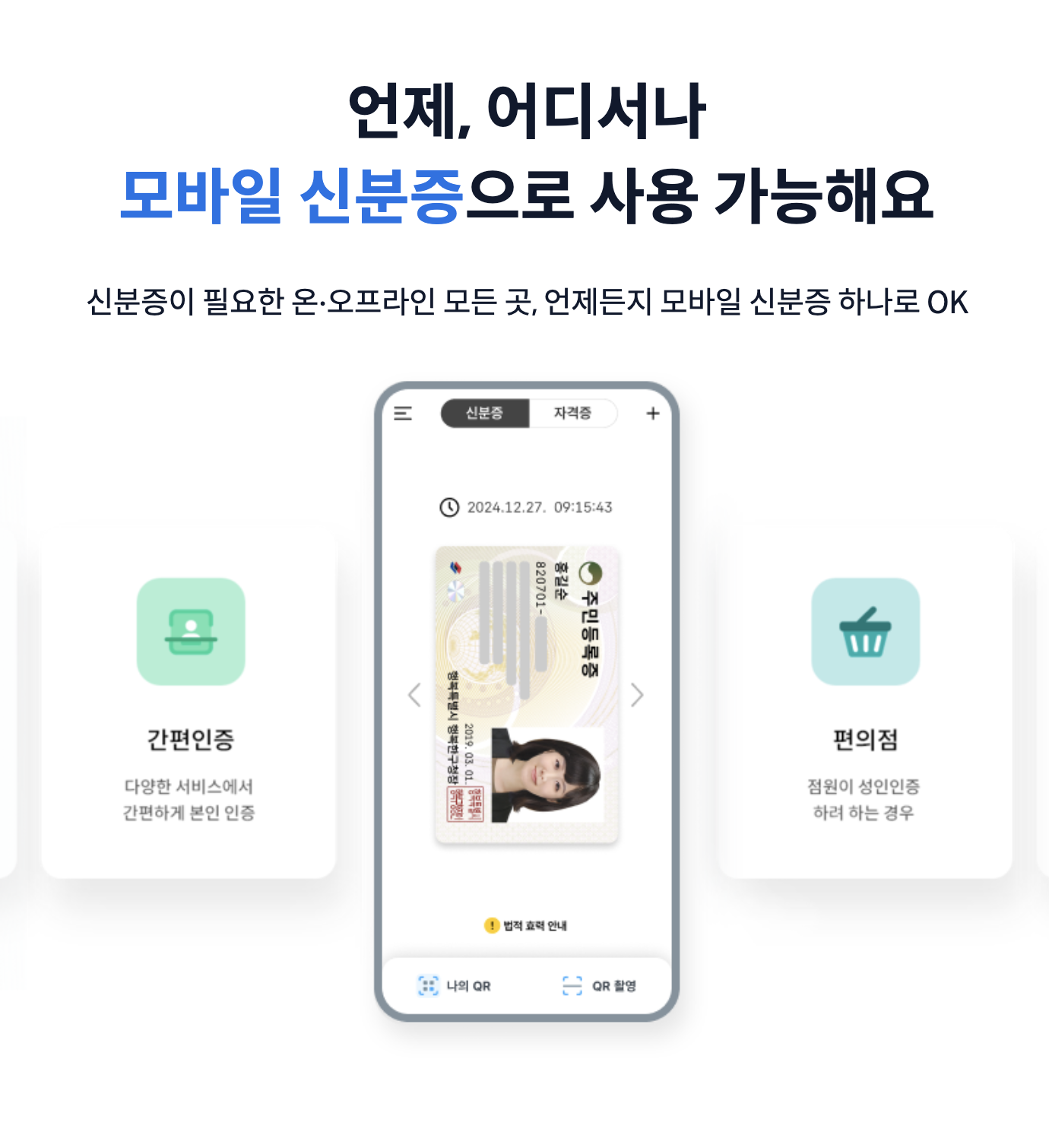 모바일 신분증은 오프라인은 물론 온라인에서도 사용 가능합니다. 22년 하반기부터 국내 최초 디지털 신분증이 사용되게 되면서 일상에서 자주 볼 수 있게 되었는데요! 기존에는 모바일 운전면허증과 국가보훈등록증, 재외국민 신원확인증을 모바일 신분증으로 스마트폰으로 간편하게 증명할 수 있었는데, 25년도 3월부터 주민등록증으로까지 범위가 확대되면서 신분 확인 수단이 추가가 되게 되었습니다. 아무래도 운전면허증이나 특정자격이 있는 사람들만 사용할 수 있기 때문에 운전면허증이나 특정자격에 해당이 없으신 분들은 혜택을 받기 어려우셨을 것 같아요. 이제는 대한민국 17세 이상의 국민이시라면, 아래 링크의 어플을 통해 언제 어디서든 모바일 주민등록증으로 편하게 신원확인이 가능하게되었습니다!