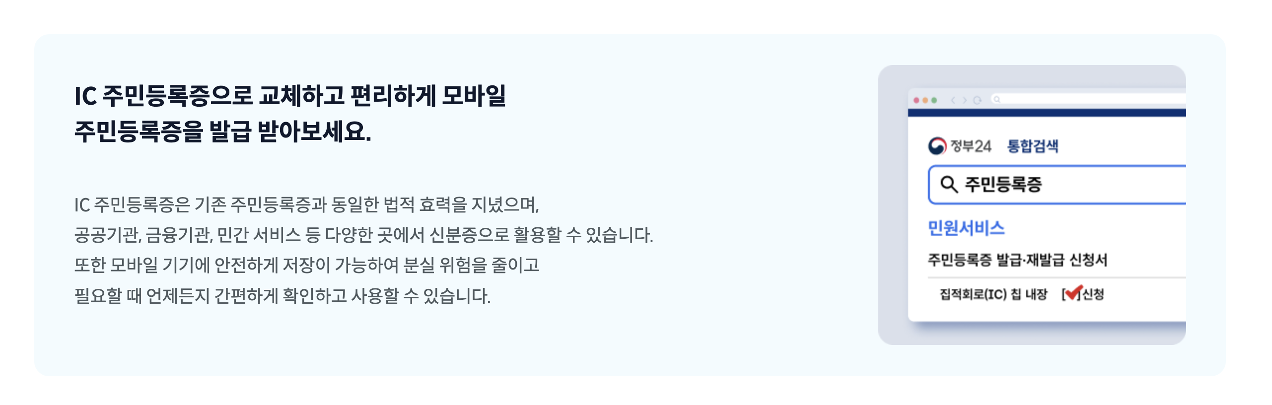 팁: IC 주민등록증을 발급받으면, 추후 스마트폰을 교체하더라도 IC 주민등록증을 활용하여 모바일 주민등록증을 재발급할 수 있어 편리합니다.