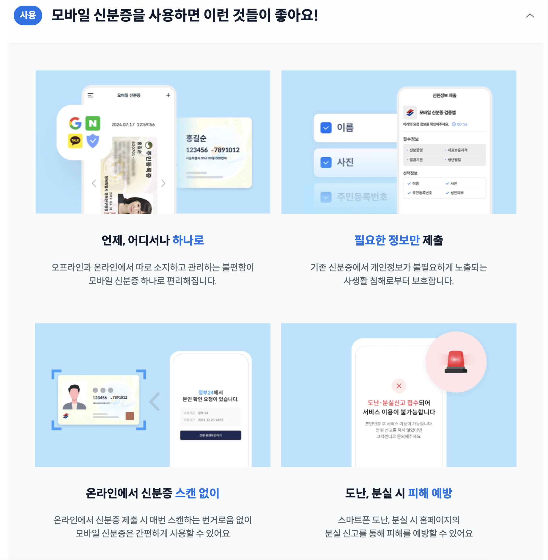 모바일 신분증은 공공기관에서 민원처리 시, 은행에서 금융업무에 신분증이 필요할 때 편의점, 무인자판기 등에서 성인확인 필요시, 온라인(정부 24 등)에서 신원확인, 앱으로 렌터카와 킥보드 대여 시 면허확인 등 신분증이 필요한 모든 곳에서 편리하게 사용할 수 있답니다. 기존 신분증에서 개인정보가 불필요하게 노출되는 사생활 침해로부터 사용자를 보호할 수 있습니다. 또한 온라인에서 신분증 스캔할 필요가 없이 모바일 신분증은 간편하게 사용이 가능합니다. 모바일 주민등록증은 2024년 12월 27일부터 9개 지자체에서 시범 운영을 시작하여, 2025년 3월 14일부터 전국적으로 발급이 확대되었습니다.