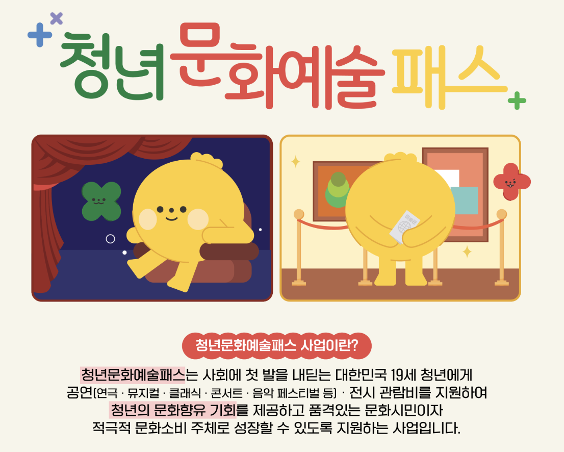 청년문화예술패스는 사회에 첫 발을 내딛는 대한민국 19세 청년에게 공연(연극·뮤지컬·클래식·콘서트· 음악 페스티벌 등 ) · 전시 관람비를 지원하여 청년의 문화향유 기회를 제공하고 품격있는 문화시민이자 적극적 문화소비 주체로 성장할 수 있도록 지원하는 사업이랍니다! 대한민국 19세 청년이시라면 이번 기회 놓칠 수 없겠죠?! 친구들에게도 알려서 어서 신청하세요!