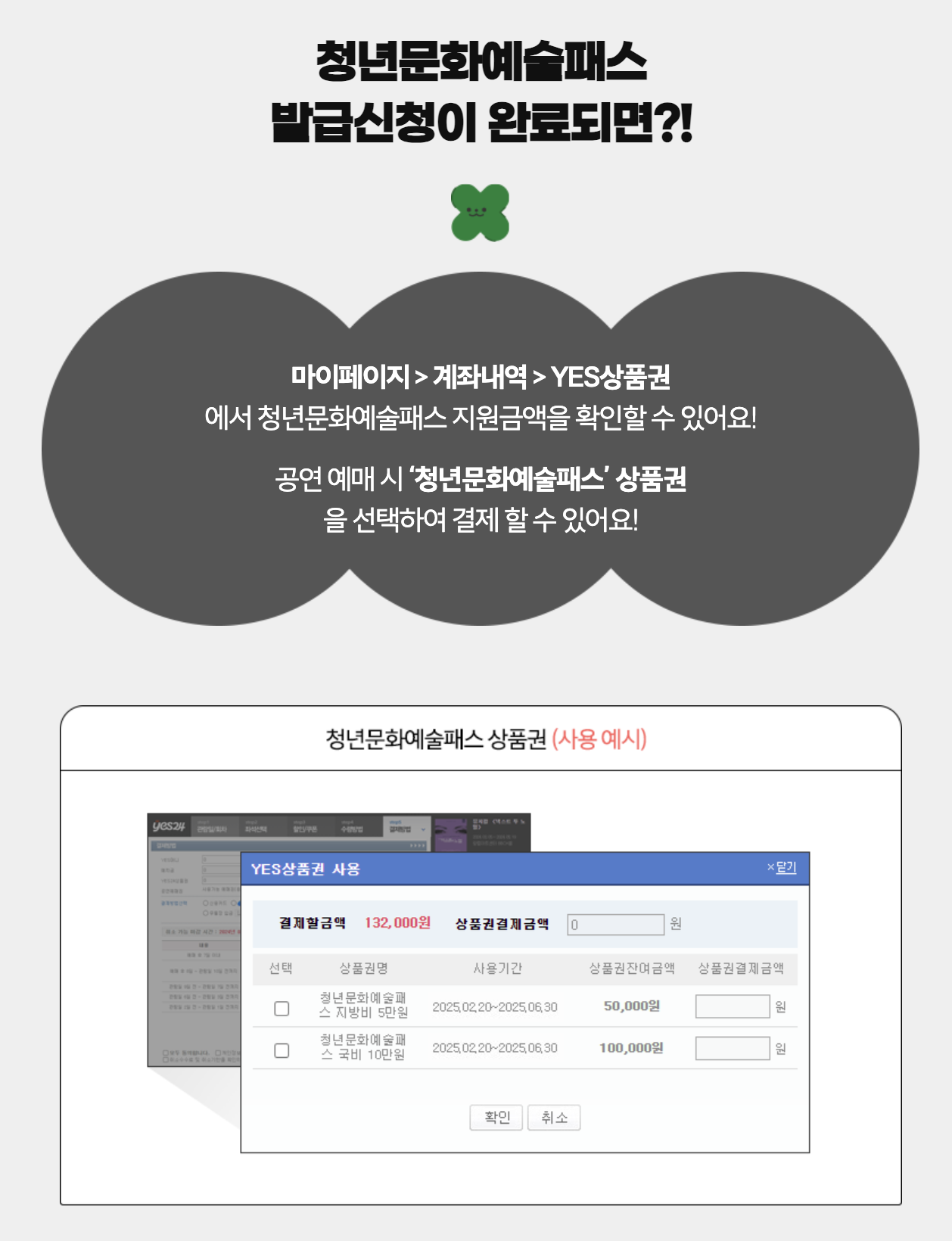 - 청년문화예술패스는 현금 또는 실물카드를 지급하는 방식이 아닌 신청 시 선택한 협력예매처로 지급됩니다. (인터파크 티켓 : 포인트 / YES24 티켓 : YES상품권)